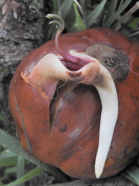 Each one sends out a long pinkish taproot that bores into the earth, and also releases a finely leafed sprout that forms above ground on a rose-colored stem. If it survives, this sprout will become the new tree.
