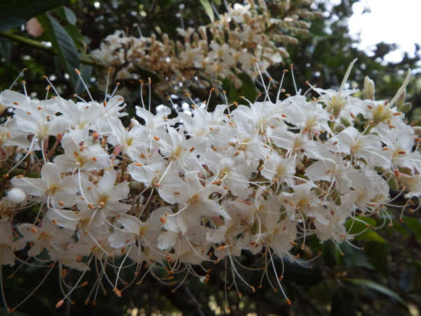 In the spring, the California Buckeye trees display long four to eight inch panicles of small, sweet-scented flowers which attract a wide variety of pollinators. The blossoms are a favorite of the Tiger Swallowtail butterflies, and the trees are also hosts to the caterpillars of the Echo Blue Butterfly. Photo by Mary K. Hanson.