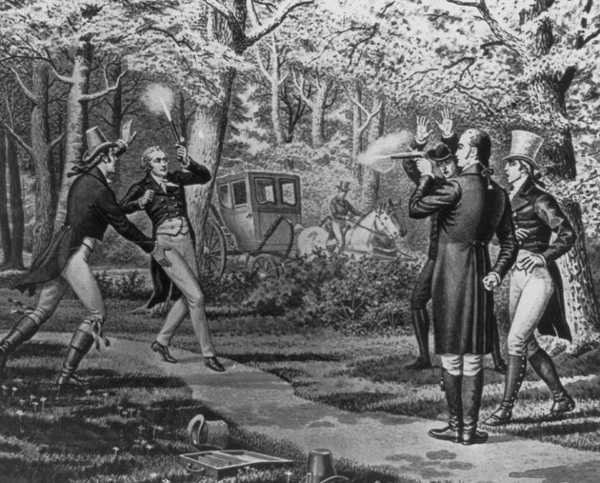 The duel between Alexander Hamilton and Aaron Burr. Public domain image.