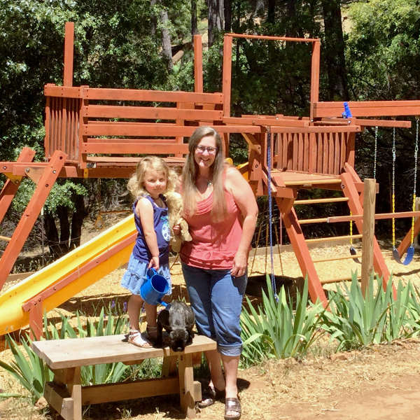 Jules Stout, owner/director/teacher at Pine Summit Seedlings Preschool, and her daughter and student Cassidy, at the center’s play structure in Cobb, Calif. Courtesy photo.