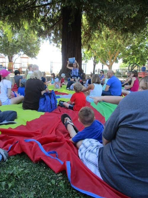Each Friday morning at 10:15 a.m., in the shade of the big trees with a breeze coming in from the lake, children, with their adult, gather on a huge parachute and enjoy the stories read by Miss Barbara.
