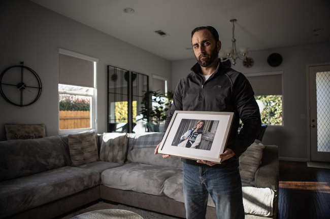 Nora Lopez holds a framed photo of her son at her home in Castro Valley on March 12, 2025. Her 29-year-old son, Dominic Lopez-Toney, was struck and killed by a semi-truck days before starting his surgical rotation at a San Joaquin hospital. Photo by Christie Hemm Klok for CalMatters