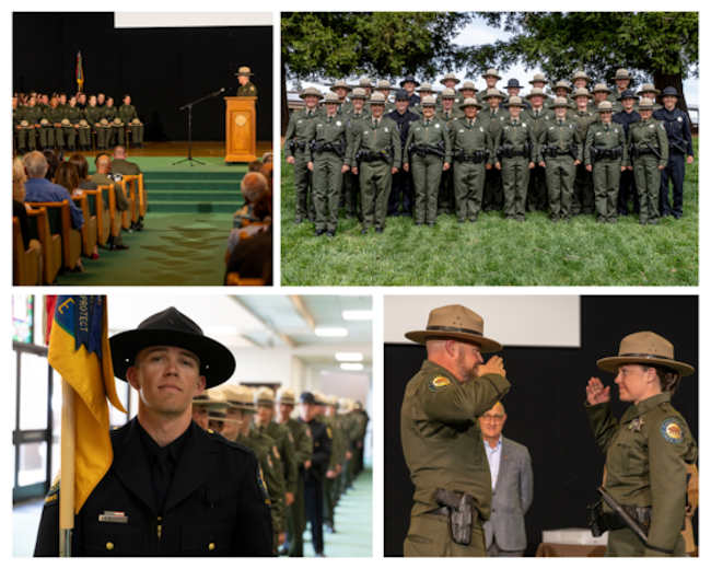 Top left: State Parks Peace Officer graduation ceremony on April 11, 2025. Top right: BVST 50 graduating class. Bottom left: Lifeguard Heath Hawkins leads the graduates into the auditorium. Bottom right: State Parks most senior ranger, Andrew Ahlberg, salutes the newest ranger, his daughter, Jordyn Ahlberg. Photos from California State Parks. California State Parks celebrated the graduation of 32 cadets on Friday, April 11.