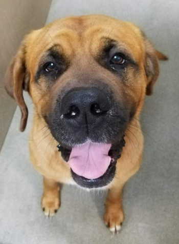 This male mastiff mix has a short brown and black coat.