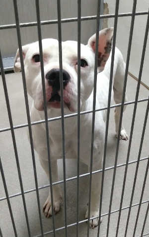 “Baxter” is a male pit bull with a short white coat.