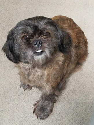 “Trixie” is a female Pekingese with a shaved brindle coat.