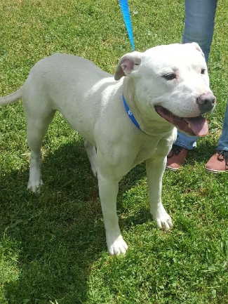 This male pit bull terrier mix has a short white coat.