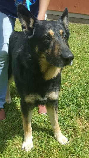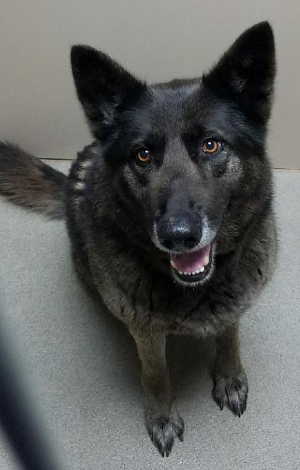 “Kuma” is a female German Shepherd with a long black and tan coat.
