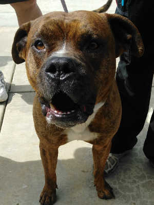 This male pit bull-Rottweiler mix has a short brown and brindle coat.