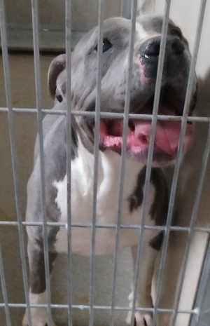 This female pit bull terrier has a short blue and white coat.