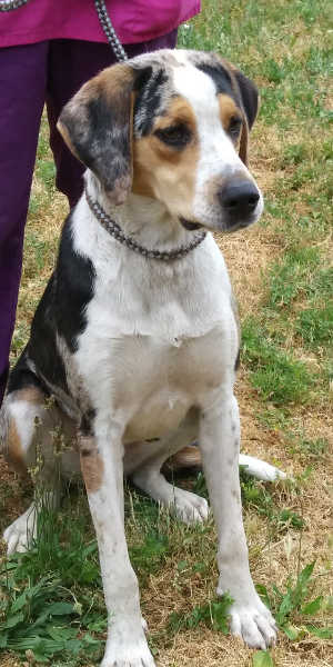 “Kino” is a senior bluetick coonhound with a short blue merle and brown coat.