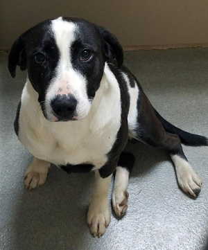 This female hound-Labrador Retriever mix has a short black and white coat.