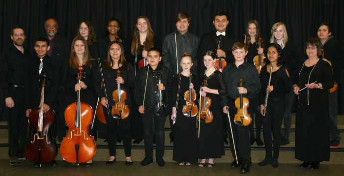 The Lake County Youth Orchestra: front row, left to right, music teacher Jeff Ives, Christian Contreras, Talia Nash, Diana Cortez, Marco Cortez, Nicole Pyzer, Maya Leonard, Michael Sprinkel, Jenny Landeta and conductor Sue Condit; back row, left to right, music teacher Clovice Lewis, Talya Luciani, Polina Bradley, Samantha Carter, Garrett Grossner, Rafael Contreras, Madelyn Madrzyk, Molly Silva and Aiden Hernandez. Photo by David Velasquez.