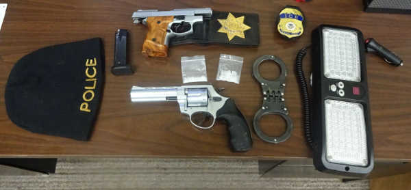 KELSEYVILLE, Calif. – Authorities have arrested a Clearlake man who they say impersonated law enforcement when he pulled a woman over early Wednesday morning in the Kelseyville area, and who was in possession of badges, a light bar, blank-firing pistols and drugs.