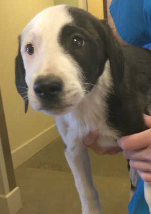 This female Labrador Retriever mix puppy has a short black and white coat.