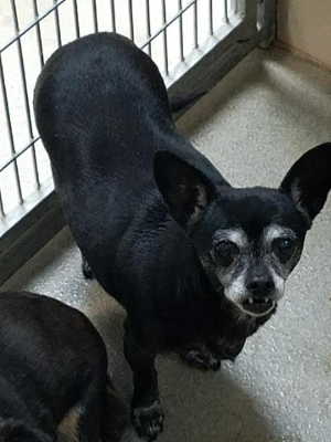 “Sadie” is a female Chihuahua with a short black and gray coat.