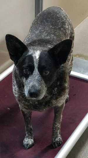 “Panda” is a female blue heeler mix with a medium-length coat.