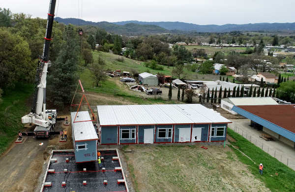 On April 5, a large crane placed new modular classrooms and single use restrooms on the prepared site.