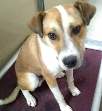 This male terrier mix has a tan and white coat.
