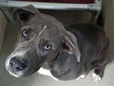 This female pit bull terrier has a short blue coat with white markings.