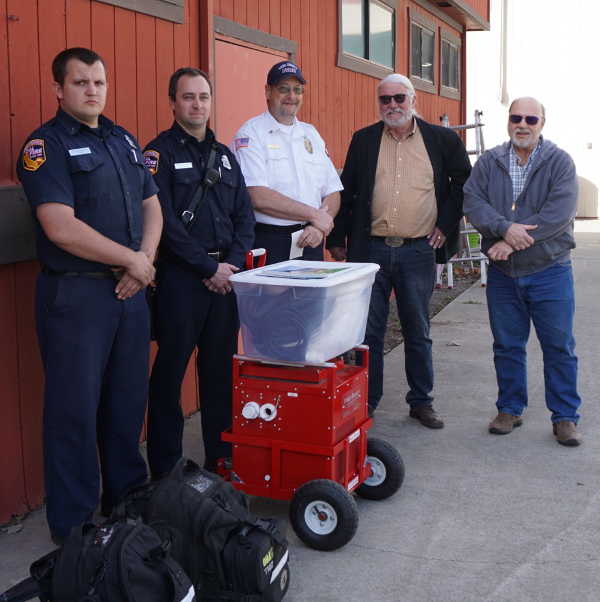 From left, Cal Fire firefighters Tyler Lange and Jonathan Hoag, Lake County Fire Protection District Chief Willie Sapeta, and Lake Area Rotary Club Association representatives Dirk Slooten and Russ Cremer at the Lake County Fire Protection District main station in Clearlake, Calif., on Tuesday, February 20, 2018, in Clearlake, Calif. With them is a Polar Breeze thermal rehabilitation unit (the red wheeled unit), as well as two fire line EMT-paramedic supply packs, purchased with donations from the association. Photo by Elizabeth Larson/Lake County News.