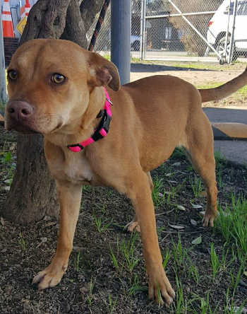 “Baby” is a female pit bull terrier with a short fawn coat.