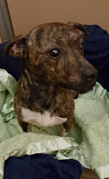 He is about a year old, weighs 12 pounds, has been neutered and has a short brindle coat.