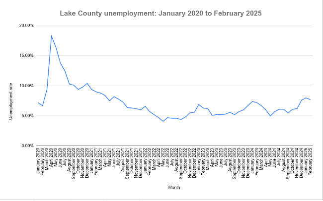 In Lake County, the unemployment rate was 7.7% in February, down from 8% in January. Lake County’s February 2024 rate was 7.2%.