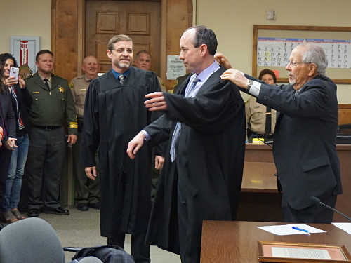 At right, Jeffrey Markham helps his son, Judge J. David Markham, don his judicial robe for the first time after being sworn in as the newest Lake County Superior Court judge, as Judge Andrew Blum looks on, on Friday, February 9, 2018, in Lakeport, Calif. Photo by Elizabeth Larson/Lake County News.