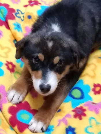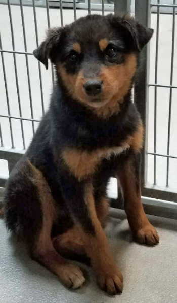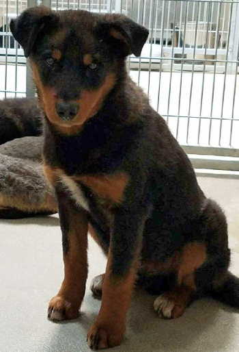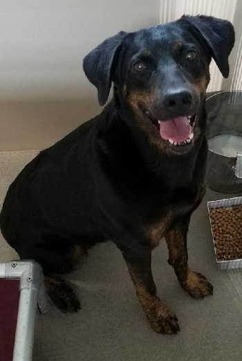 “Bella” is a female Labrador Retriever-Rottweiler mix with a short black and brown coat.