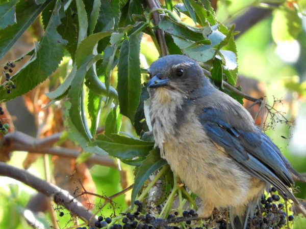 The California Scrub Jay’s diet is comprised mainly of insects, berries, vegetables and small frogs and lizards, but they’ll also eat eggs and the hatchlings of other birds. This jay was feeding on ripe Blue Elderberry berries. Photo by Mary K. Hanson. NORTHERN CALIFORNIA – It’s hard to ignore them when they’re shouting their loud, rasping “shreeep!” calls at one another.