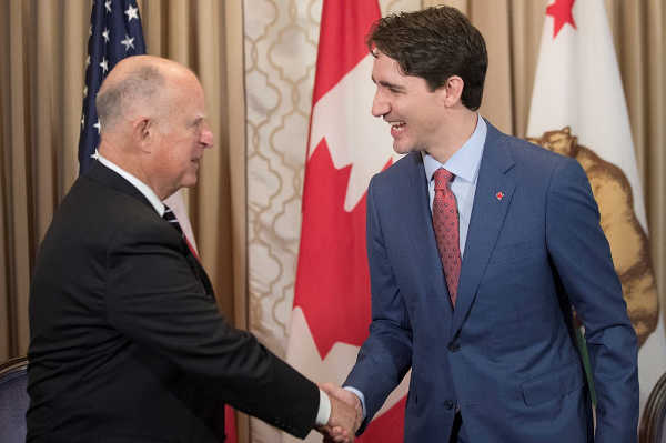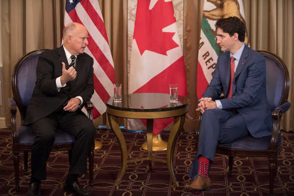 California Governor Jerry Brown on Friday met with Prime Minister of Canada Justin Trudeau in San Francisco, where the two leaders pledged to expand cooperation on climate action, trade and criminal justice reform.
