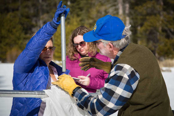 Manual measurements augment the electronic readings from the snow pillows in the Sierra Nevada that provide a current snapshot of the water content in the snowpack.