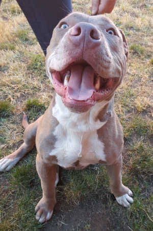 This male pit bull terrier has a short blue and white coat.