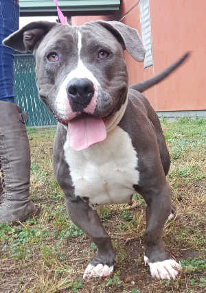 This female pit bull terrier has a short blue coat.