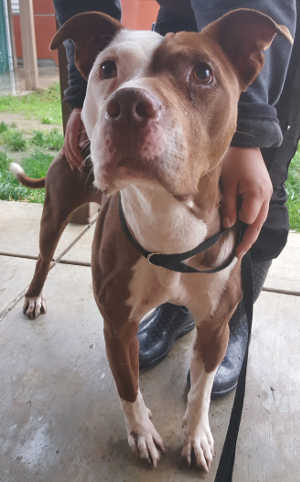 This female pit bull terrier has a short red and white coat.