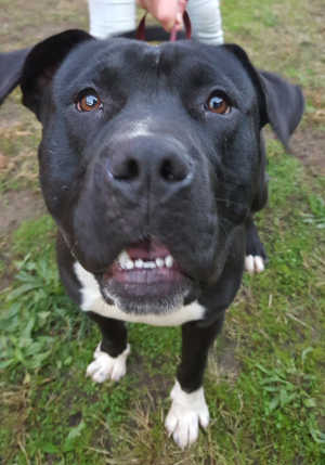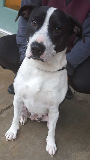 This male pit bull terrier has a short black and white coat.