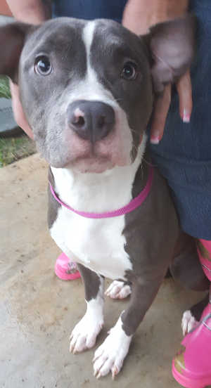 This female pit bull terrier has a short blue and white coat.
