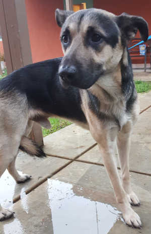 This male shepherd has a medium-length black and brown coat.