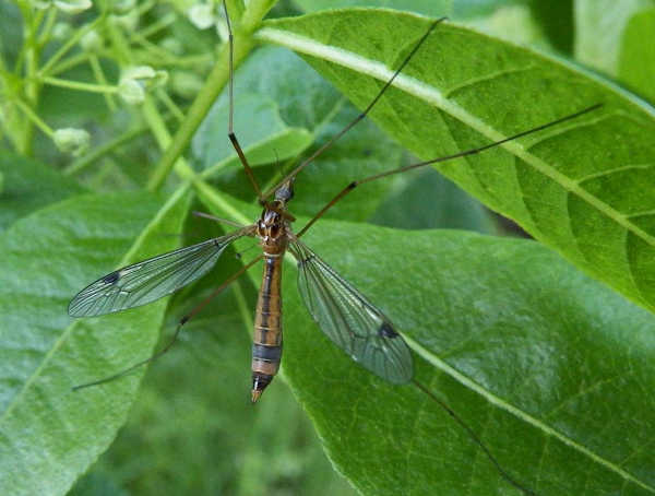 Look in between this crane fly’s left wing and leg and you’ll see a tiny protrusion called a “haltere”; it helps to stabilize the fly in flight. Photo by Mary K. Hanson. On the females, the other distinguishing feature is their elongated ovipositor which pokes out of the back end of the abdomen and looks like a thick stinger. Snake flies don’t sting, but they do have tough mouth parts and can give you a nip if you mishandle them.