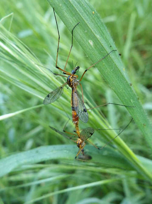 This is a mating pair of crane flies. The yellow-orange ones are sometimes referred to as “tigers”, but they’re not in the least bit ferocious. Most adult crane flies don’t eat or drink much of anything, and some of the 15,000 species don’t even have mouth parts. Photo by Mary K. Hanson.