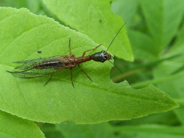 That long ovipositor allows the female snake fly to bore into and under the bark of trees to lay her eggs. The eggs hatch into larvae that look sort of, well, Frankenstein-ish. The front half looks like an adult snake fly, but the back end is long and wormlike, like a giant stomach.