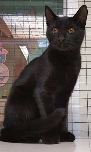 This domestic short hair cat of undetermined gender has a short black coat and gold eyes.