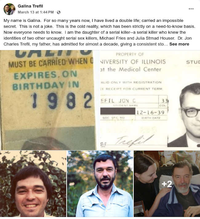 My name is Galina. For so many years now, I have lived a double life; carried an impossible secret. This is not a joke. This is the cold reality, which has been strictly on a need-to-know basis. Now everyone needs to know. I am the daughter of a serial killer--a serial killer who knew the identities of two other uncaught serial sex killers, Michael Fries and Julia Strnad Houser. Dr. Jon Charles Trefil, my father, has admitted for almost a decade, giving a consistent story, to being a serial killer ON TAPE, graphically. FBPD, the Sheriff's Department, the Mendocino County DA's Office, they are all aware of his confessions. This is the secret that the authorities in Mendocino County are not sharing with the public. At this point, Jon is 86 years old. He's admitted to being a serial killer to roughly over a dozen people. He's asked repeatedly if only someone, some authority, would take him back to the dump sites where he put the bodies. He's promised that he will point to where the bodies are if police will only take him. They haven't been willing to do so, and he's remained, while bedridden, still free. He wants to tell his story. He actually wants to go public with his crimes. He's given his blessing for me to do so in his stead. Though, at times, he's also promised to fake being crazy if he's actually arrested. I, his daughter, have been asked by law enforcement how old he is, and I respond to them, "Well, he's almost a decade older than when I first contacted law enforcement." I have devoted my life to bringing Jon to justice. At this point, the DA's office has dozens of hours of him discussing his murders in intense detail. How he kidnapped. Who he kidnapped. How he kept victims prisoner, sometimes for weeks at a time before killing them. How he tortured. How he killed. Though he said that he began killing in the 1950s, he only really made it a habit from the summer of 1965 to approximately 1999. From 1965 onward, he admitted to murdering one person, give or take, per month. Female, male, old, young, and couples. The states involved are Illinois, California, Virginia, Oregon, and Idaho. The outside countries are Canada, France, the Netherlands, and along the Mexican boarder. Most killings occurred in California, with the specified counties being San Francisco, Marin, Alameda, Lake, Mendocino, Sonoma, and one unidentified county that shares the Northern Mendocino border. The fact that he's 86 should not matter in this case. There is no statute of limitations on murder, and most importantly he can give closure by saying where the bodies. He murdered my grandfather and laughed about killing two of my great-grandparents. He murdered multiple other people that, as a small child, I met back in the early 1980s. When I realized that he was a serial killer in January of 2012, I knew that he'd gone under the radar. If I let it happen, he would probably never be caught. Instead, I decided to devote the next 13 years of my life to building a case for the prosecution, so that the families of the dead could have the justice that they so deserve. The families deserve the opportunity to bury their daughters and sons; the opportunity while my father is still alive that they may stand in a courtroom and give an impact statement. I have contacted every jurisdiction wherein Jon admitted to murder. I have spoken to and given lengthy interviews with law enforcement over 40 times. I have provided DNA samples to law enforcement. At great personal physical risk, I retrieved my father's diaries, wherein he discusses some of the murders. To date, law enforcement hasn't even been willing to read those diaries. I got two of the murder weapons, including a vial of strychnine that Jon used to keep in his medical bag. No one's been willing to take it into custody. Last year, I was able to convince my father to cough up a few of the specific gravesite locations. The bodies of undiscovered victims are located at several places on "13 Curves" on HWY 20--mainly between the 4.5 to 5 mile marker. Also on the Comptche-Ukiah Road, Jon's Albion property, and at a murder cabin in Comptche. He's acknowledged two other murder cabins, located in Westport and Boonville. I asked law enforcement to put a wire on me. To date, they have not been willing to put a wire on me. I have been told that other, more recent cases, take precedent over cold cases. They took Jon's DNA, but have not been willing to put it, or my own volunteered DNA, into CODIS. Over the years, I built a posse, consisting mainly of seven key people, with an additional dozen or so helpers, who have also devoted themselves to bringing Jon Trefil to justice. Pure warriors, and the strain has weighed in on all of them. The time has come to go public though. I am asking the Mendocino County community for help. My father has repeatedly said that there were many victims who actually got away, some of whom were his patients. Hitchhikers, mostly picked up from the Willits junction, and tourists, were his main victims in Mendocino County, he said. He knew that they wouldn't be missed. IF YOU HAVE INFORMATION, PLEASE GO TO THE MENDOCINO COUNTY AUTHORITIES. I'm afraid that, given the lack of DNA analysis, this case absolutely will not be solved without the other surviving victims being willing to come forward. Thank you. Please share.