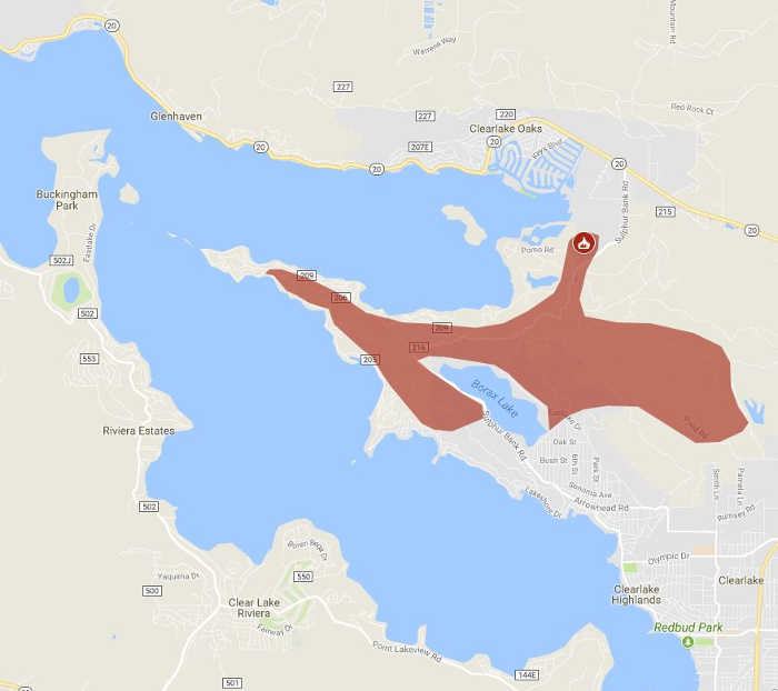 He said the fire was located primarily on the back side of Eastlake Drive, all the way up to the top of Sulphur Bank Drive where there is a hard closure at 18th, Bush and Sulphur Bank, as well as past Mendocino Street off of Lakeshore Drive on the gooseneck, and just on the east side of Windflower Point.