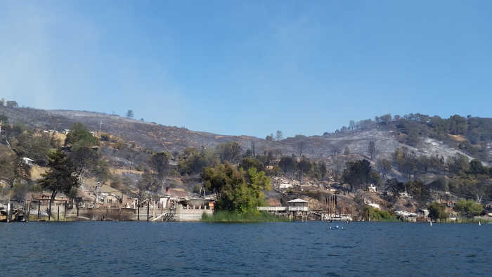The damage from the Sulphur fire seen along Lakeshore Drive from Island Park in Clearlake, Calif., on Monday, October 9, 2017. Photo by Jim Rexrode. Two shelters were opened in Lake County, one at Twin Pine Casino in Middletown – which had filled up – and the second at Grace Church, 6716 Live Oak Drive in Kelseyville.