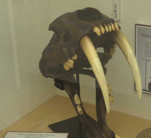 An information board in the Courthouse Museum where the replica skull of the saber-toothed cat is found, states, "The extinction of the saber-toothed cats may have been related to the decrease of the larger animals on which they preyed. There is some evidence that the mastodon was the favorite meal of some later-day species of the saber-toothed cats; both lasted in North America only until the end of the Pleistocene. Saber-toothed cats are the most famous California Ice Age fossil. Smilodon californicus was one of the last surviving members of the formidable felines called saber-toothed cats."