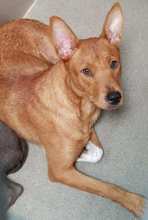 This female cattle dog has a short red coat.