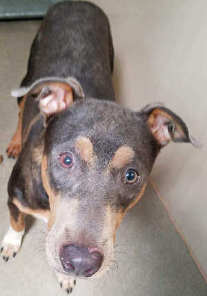 This male Doberman Pinscher-cattle dog mix has a short blue, black, tan and white coat.