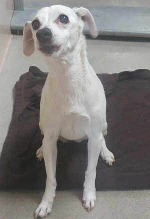 This female terrier mix has a short white coat.